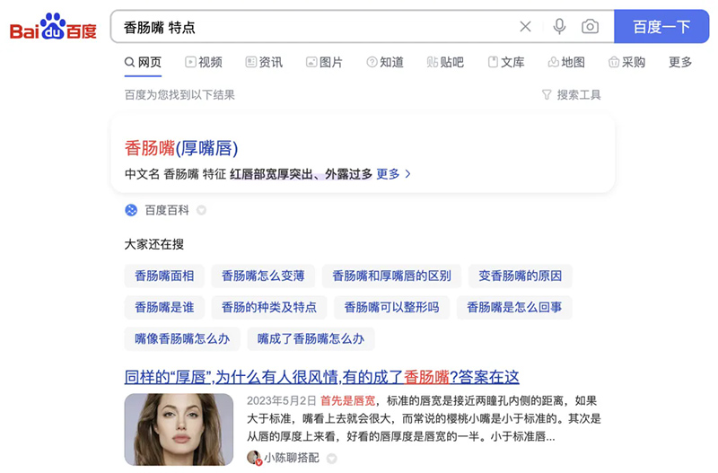 什么是搜盡奇峰打草稿?說(shuō)通俗一點(diǎn),就是找參考,總結(jié)規(guī)律、找到特點(diǎn),然后用在自己的設(shè)計(jì)當(dāng)中。搜盡奇峰打草稿最簡(jiǎn)單的方式是什么?只要你在百度的搜索框里面打上這個(gè)問(wèn)題的關(guān)鍵詞,如“香腸嘴特點(diǎn)”,就能搜索出多個(gè)特點(diǎn)。