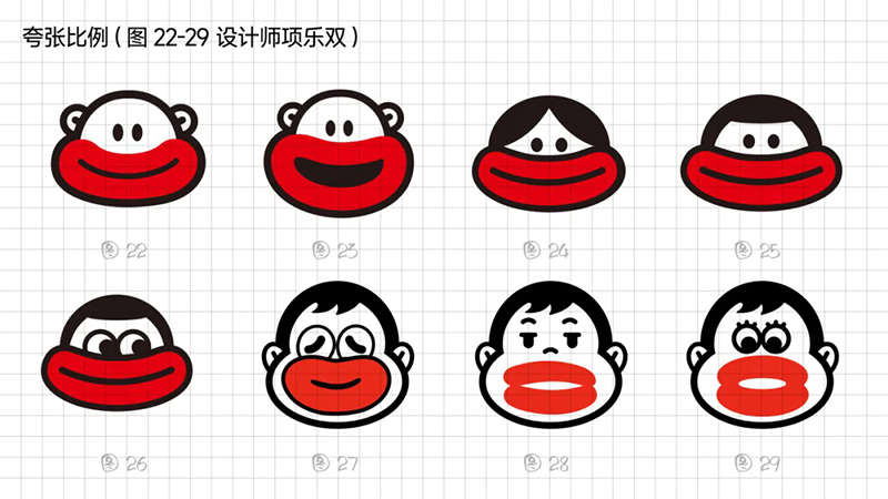 1)比例夸張:平面構(gòu)成中,特異是一個(gè)提升識(shí)別度和獨(dú)特性的表現(xiàn)手法,抓住香腸嘴“面部占比大”的特性,嘗試放大嘴唇輪廓到極致,夸張到比臉還大。