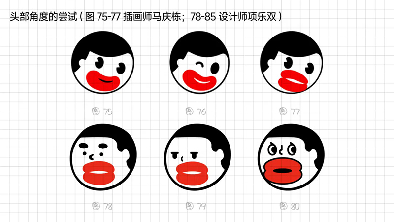 1)頭部角度的嘗試:嘗試把人物頭轉(zhuǎn)過(guò)去的感覺(jué),突出香腸嘴的體積感。結(jié)合快速拼圖法快速出符號(hào),發(fā)現(xiàn)該方向沒(méi)有達(dá)到特別的效果,犧牲了極簡(jiǎn)的中軸對(duì)稱(chēng)策略,整體氣質(zhì)卻不夠有張力和沖擊力。