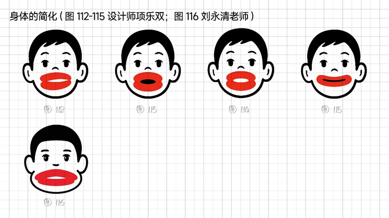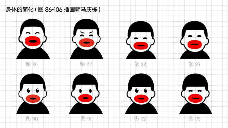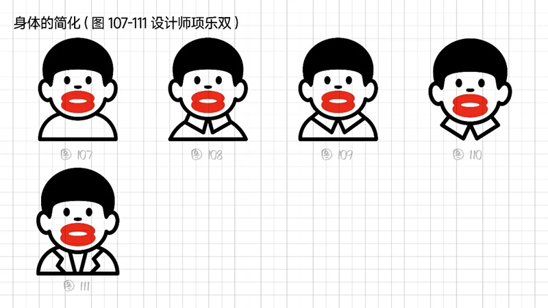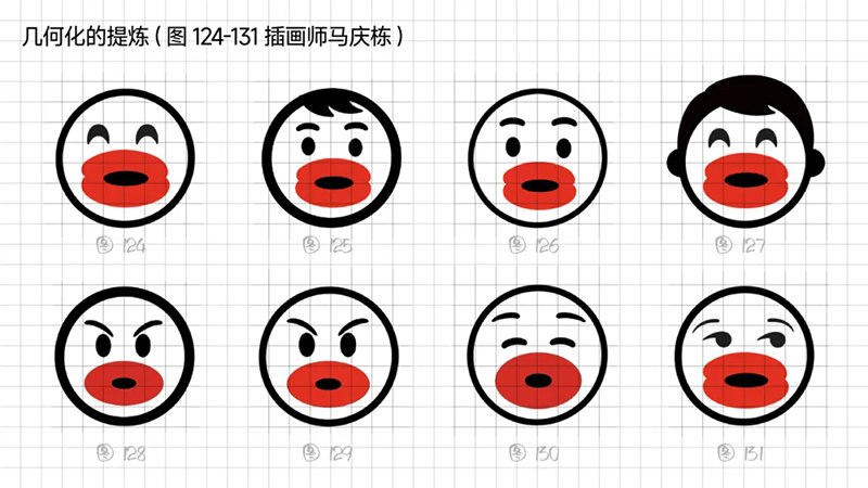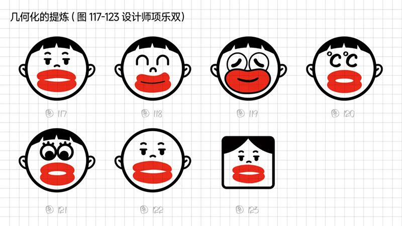 4)去外輪廓的改變:堅(jiān)持簡(jiǎn)化思路,那能不能更加簡(jiǎn)練呢?可以把能識(shí)別出臉?biāo)性睾?jiǎn)化、虛化、甚至刪除嗎?嘗試只保留眼睛、眉毛、嘴巴,就能識(shí)別。但是去掉外輪廓的表現(xiàn)手法,會(huì)使得整體圖形顯得散。