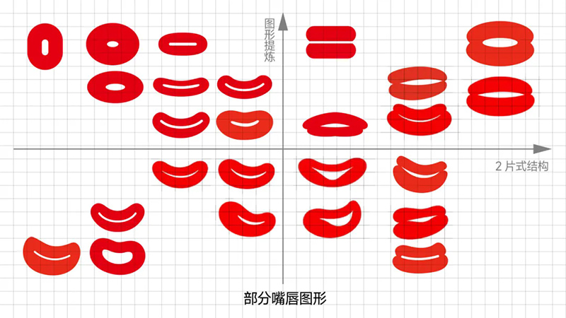 5)嘴唇圖形的提煉:進(jìn)行了寫(xiě)實(shí)、概括、提煉、變化的不同嘗試,我們重新整理復(fù)盤(pán),嘴唇的簡(jiǎn)化圖形,從構(gòu)成上主要分成2種,是2個(gè)橢圓,還是3個(gè)橢圓的變形(下圖)。
