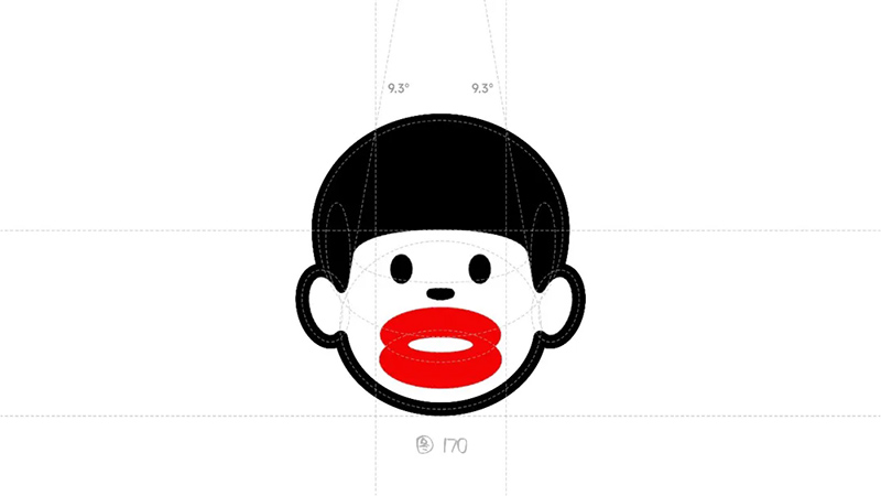 點(diǎn)線(xiàn)面的藝術(shù)提煉加工,等粗線(xiàn)條、平衡對(duì)稱(chēng)、極簡(jiǎn)符號(hào),在細(xì)節(jié)到整體上機(jī)關(guān)算盡,線(xiàn)條的呼應(yīng)關(guān)系,劉海、嘴唇、耳朵、鬢角的線(xiàn)條呼應(yīng)關(guān)系,整體比例非常協(xié)調(diào)(圖170)。